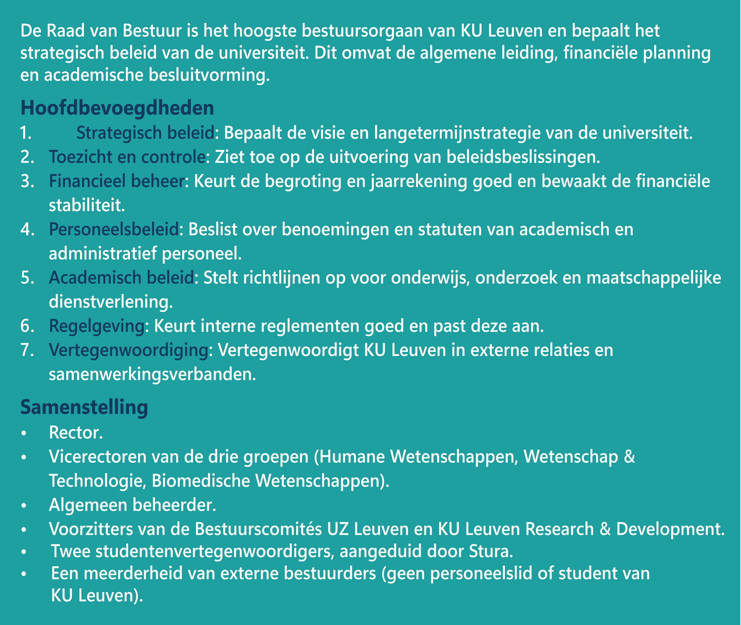 De Raad van Bestuur (RvB) is verantwoordelijk voor de vzw, het kantoor, de begroting, opvolging van de stafmedewerkers…, Ze zorgen ervoor dat de praktische zaken van de Studentenraad in orde zijn.